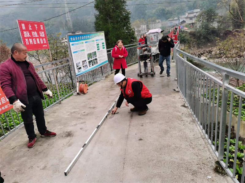 为深入推进党史学习教育“我为群众办实事”实践活动,11月26日,交建集团佳岳公司组织4名检测人员对天全县小河乡境内2条农村公路,1座铁索桥召开混凝土路面厚度、桥墩加固强度等检测,全面把控道路质量,提高群众通行安全保障。 佳岳检测公司立足本职,把工作摆进“我为群众办实事”实践活动,找准查实基层和群众的急难愁盼问题,满腔热情解决好人民群众的操心事、烦心事、揪心事。