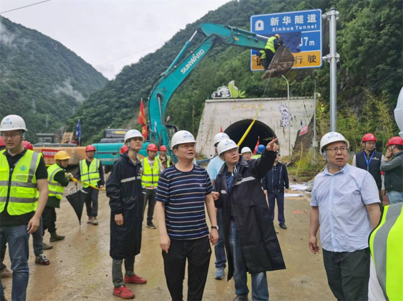 曹刚一行抵达宝兴河电站,徒步前往新华村宝兴河壅塞体查看灾情,附后前往新华村隧道口,看望慰问在抢通一线的交建集团施工人员,详细分析抢通进度和安全保障措施等情况。