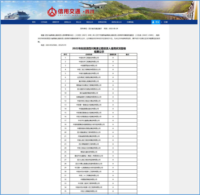 近期,四川省交通运输厅“信用交通(四川)”公示2022年拟投资四川省高速公路投资人信用状况复核结果和2022年第3批拟投资四川省高速公路投资人初次信用评价结果,雅安市交通建设(集团)有限责任公司及下属全资子公司四川康藏路桥有限责任公司取得“A”级信用评价。
