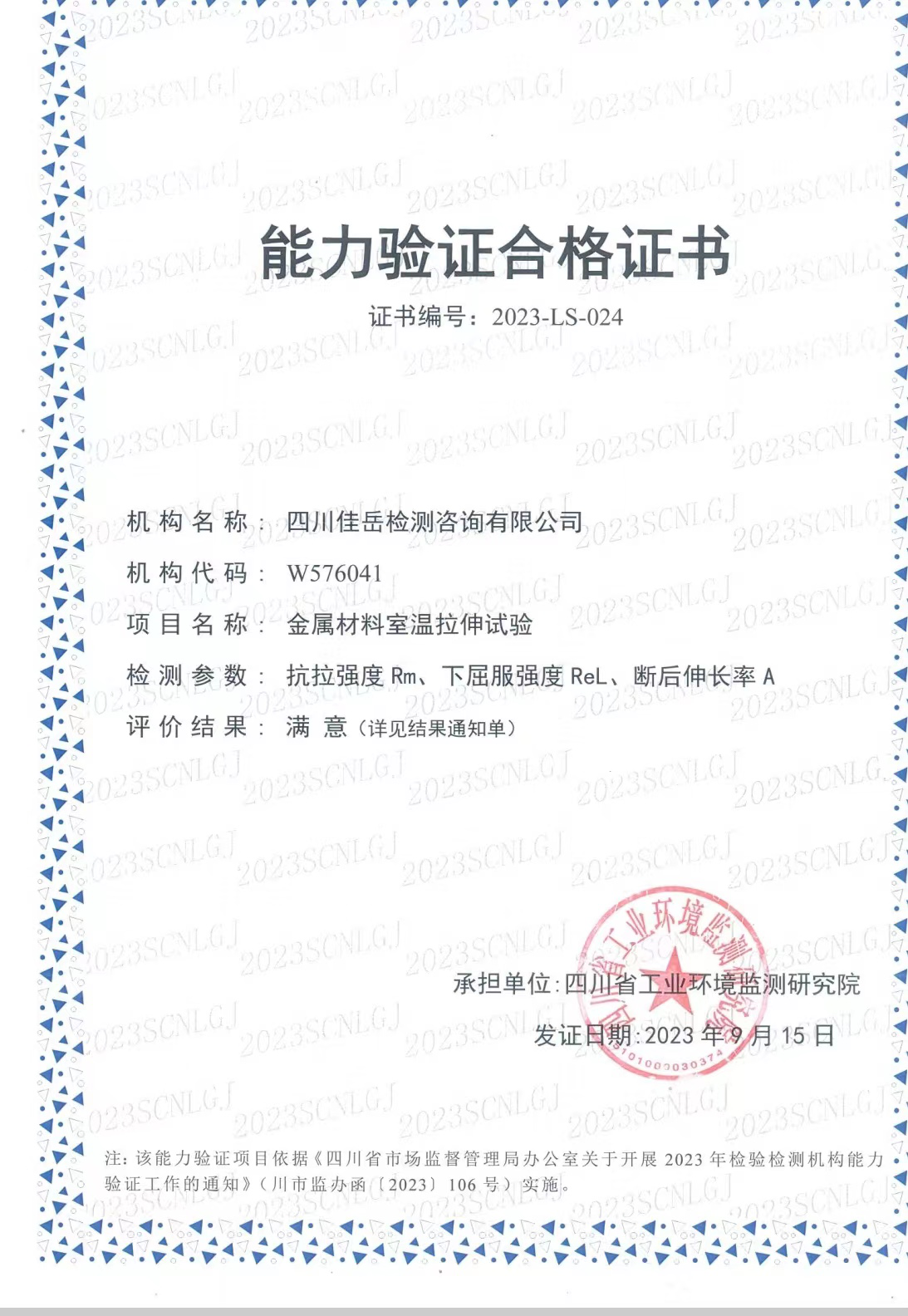 近期,四川省市场监督管理局公布2023年能力验证结果,亿万先生MR集团所属四川佳岳检测咨询公司参加的保温材料导热系数检测、室内环境污染物甲醛检测、水泥物理性能检测、金属材料室温拉伸试验等5项能力验证,评价结果均为“满意”。