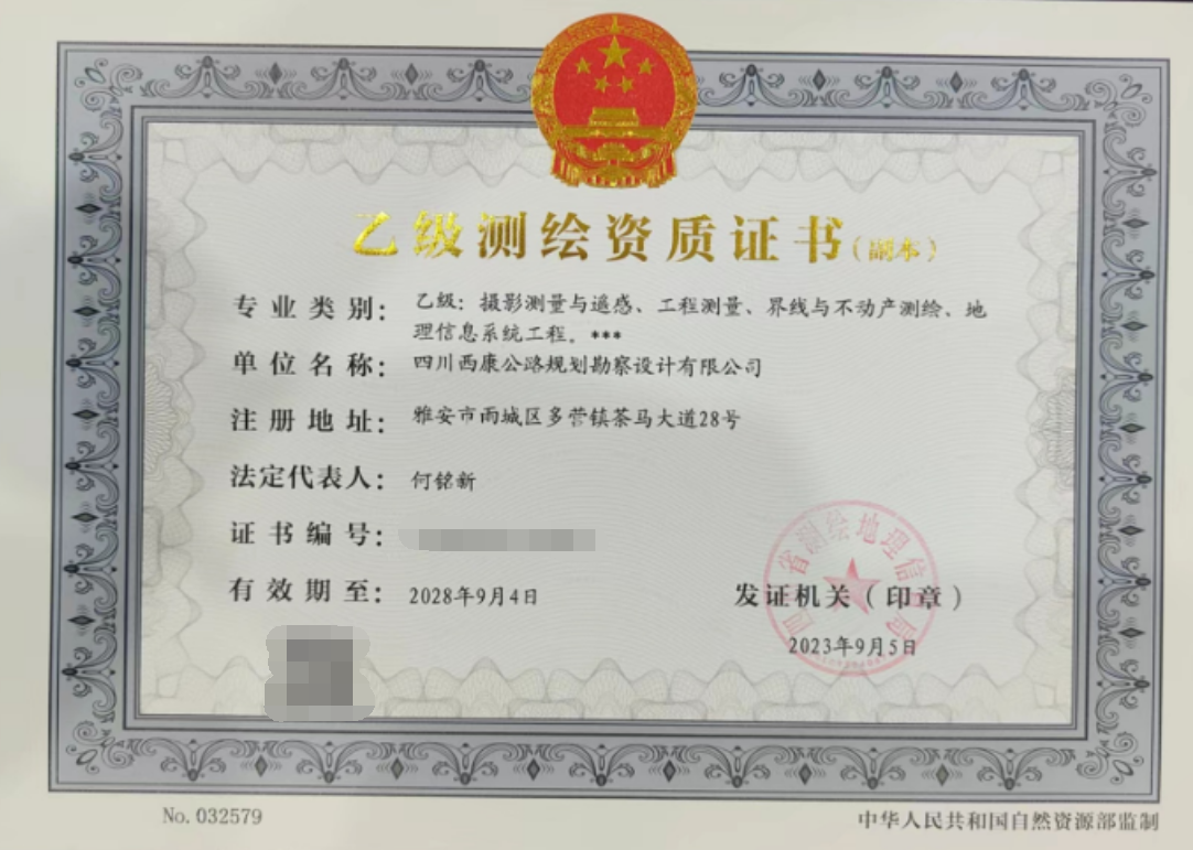 近期,经四川省测绘地理信息局批准,亿万先生MR集团西康勘察设计有限公司取得测绘乙级资质证书,标志着公司在经营产业多元化和专业化开展上取得重要突破。 测绘乙级资质证书包含摄影测量与遥感、工程测量、界线与不动产测绘、地理信息系统工程四个专业,为公司拓宽经营市场和业务承揽能力、增加新的利润点奠定了坚实基础。 下一步,公司将不断提升专业技术水平,持续做实资质提升、增项相关工作,拓展业务经营范围,助力公司高质量开展。