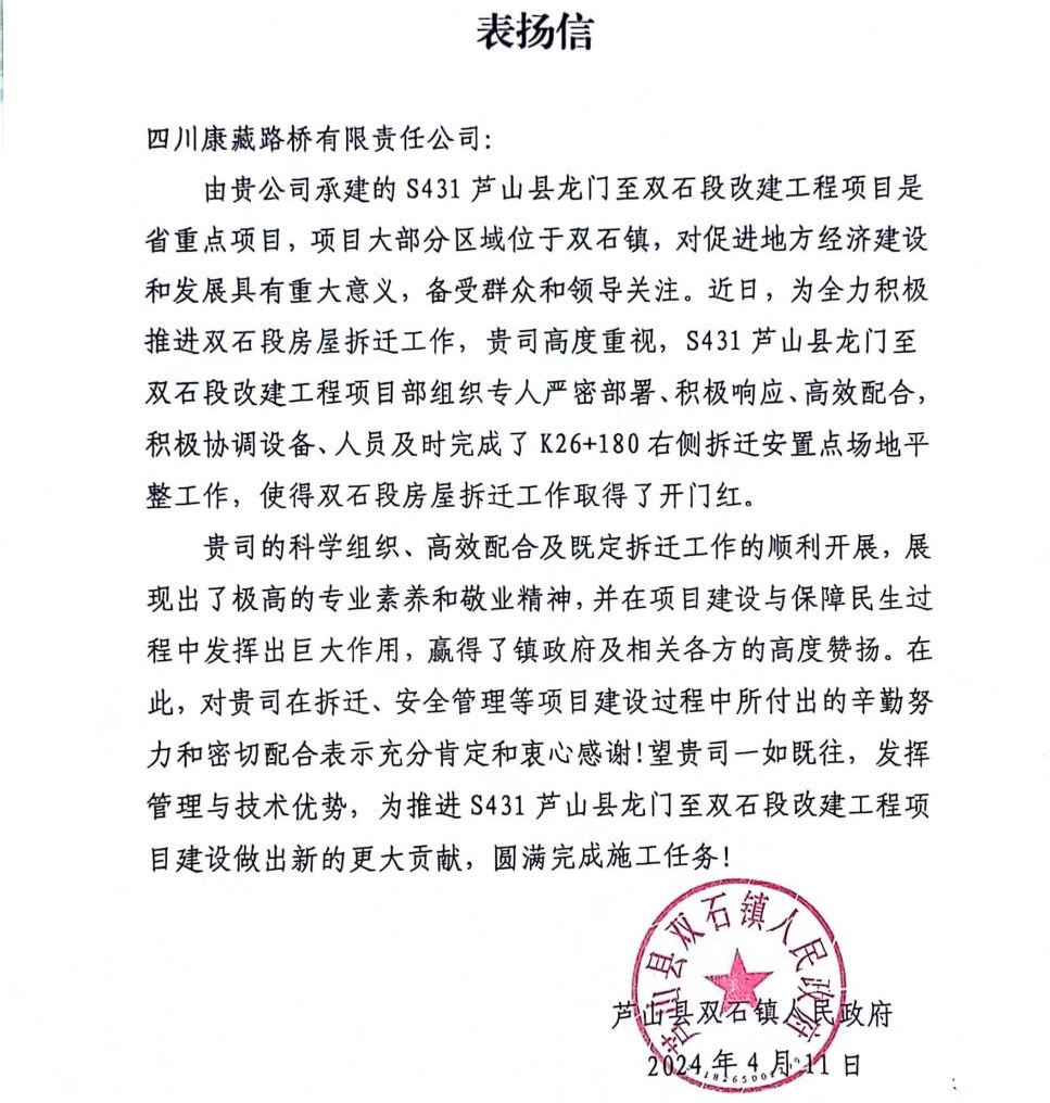 近期,亿万先生MR集团四川康藏路桥有限责任公司收到来自芦山县双石镇人民政府的表扬信。信中对S431芦山县龙门至双石段改建工程项目部持续协调设备、人员配合当地政府完成K26+180右侧拆迁安置点场地平整工作,使得双石段房屋拆迁工作取得了开门红给予了高度评价和赞扬。