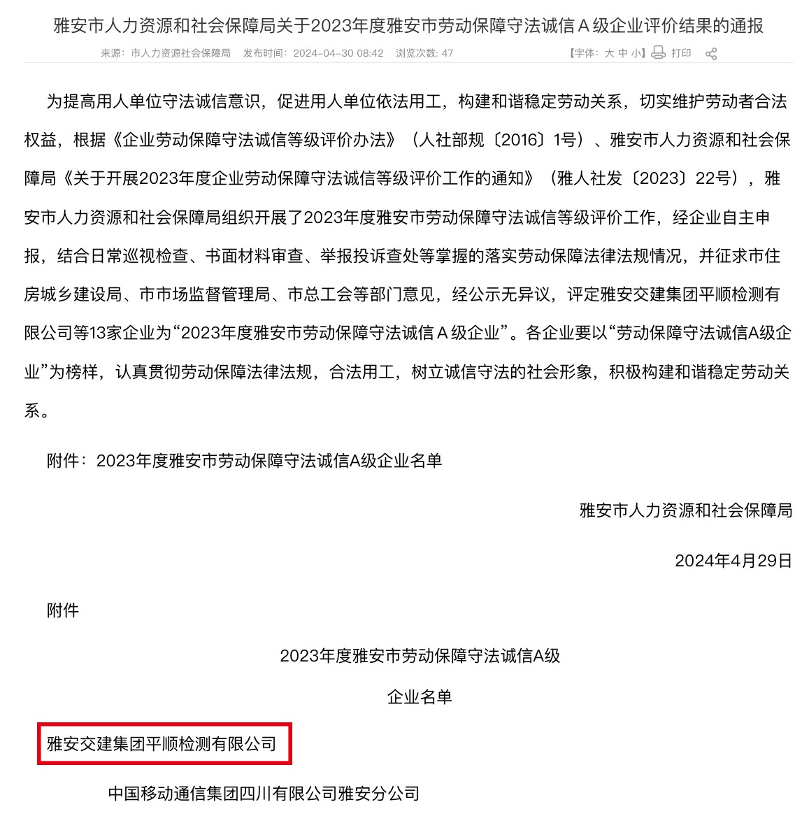 近期,雅安市人社局发布通报,亿万先生MR集团平顺公司被评定为“2023年度雅安市劳动保障守法诚信A级企业”。此次评选由人社局结合日常巡视检查、书面材料审查、举报投诉查处以及专项检查等活动掌握的落实劳动保障法律法规情况,并征求市场监管局等部门和单位意见后,综合评定而出。
