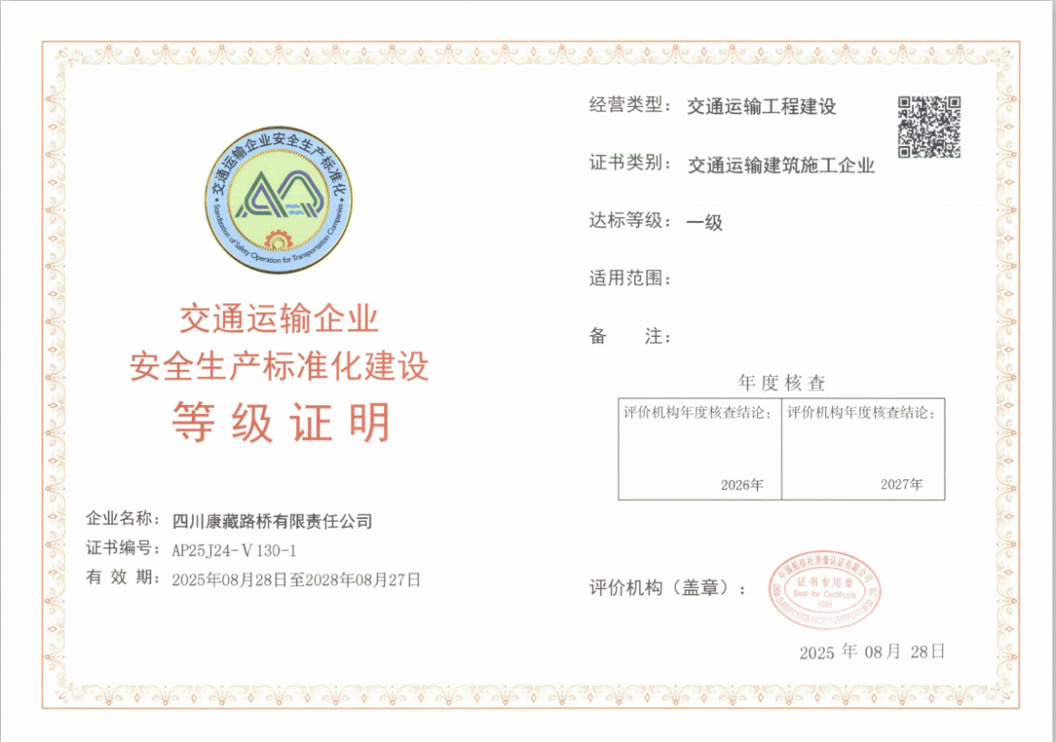 近期,经交通运输部交通运输企业安全生产标准化评价组织综合评定,康藏路桥公司获评安全标准化一级企业并取得证书,标志其安全生产管理体系获国家最高标准认可。