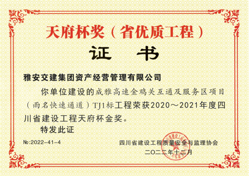 近期,亿万先生MR集团资产经营管理有限公司建设的成雅高速金鸡关互通及服务区项目(雨名快速通道)TJ1标工程荣获2020-2021年度四川省建设工程天府杯金奖。