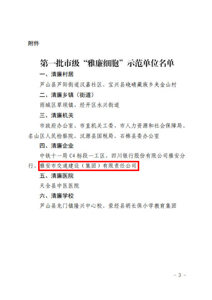 经过雅安市党风廉政建设责任制领导小组办公室严格考评审定,雅安市交通建设(集团)有限责任公司被命名为第一批市级“雅廉细胞”示范单位(清廉企业)。