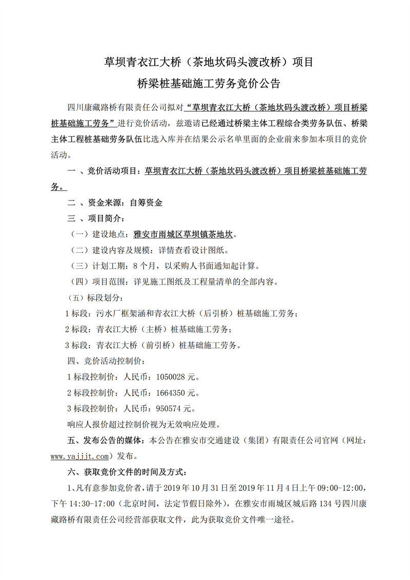 四川康藏路桥有限责任公司草坝青衣江大桥(茶地坎码头渡改桥)项目桥梁桩基础施工劳务竞价公告