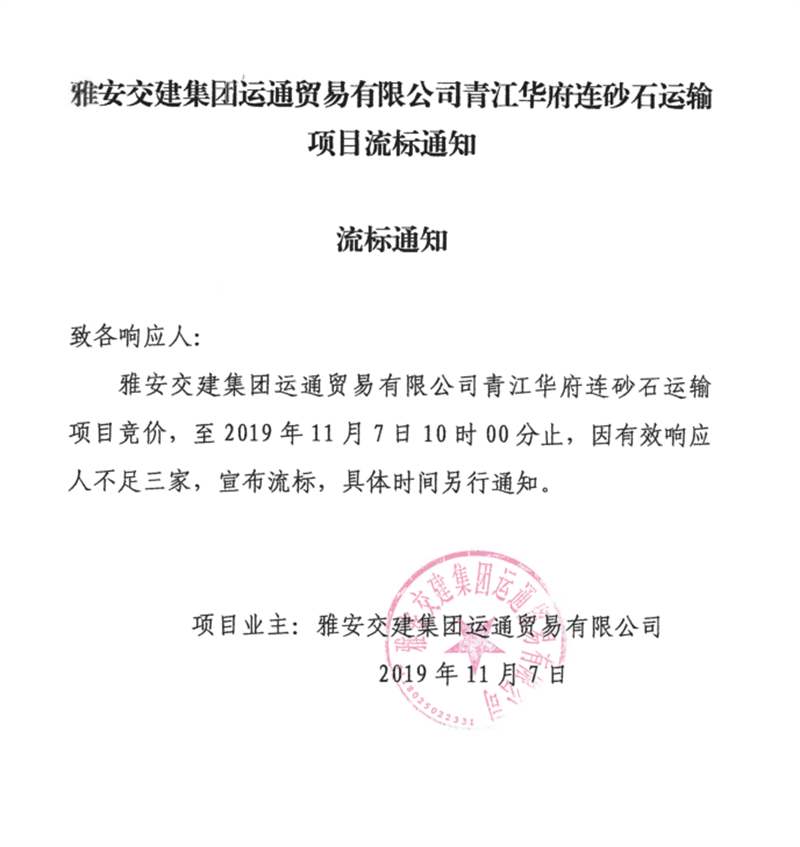 亿万先生MR集团运通贸易有限公司青江华府砂石运输项目流标通知