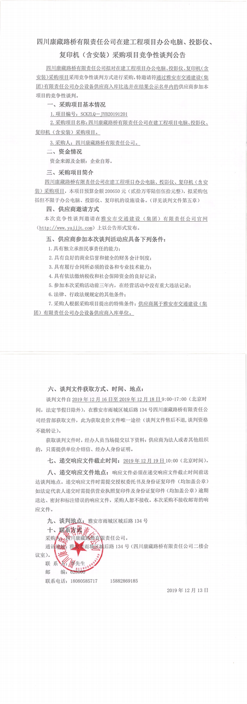 四川康藏路桥有限责任公司在建工程项目办公电脑、投影仪、复印机(含安装)采购项目竞争性谈判公告