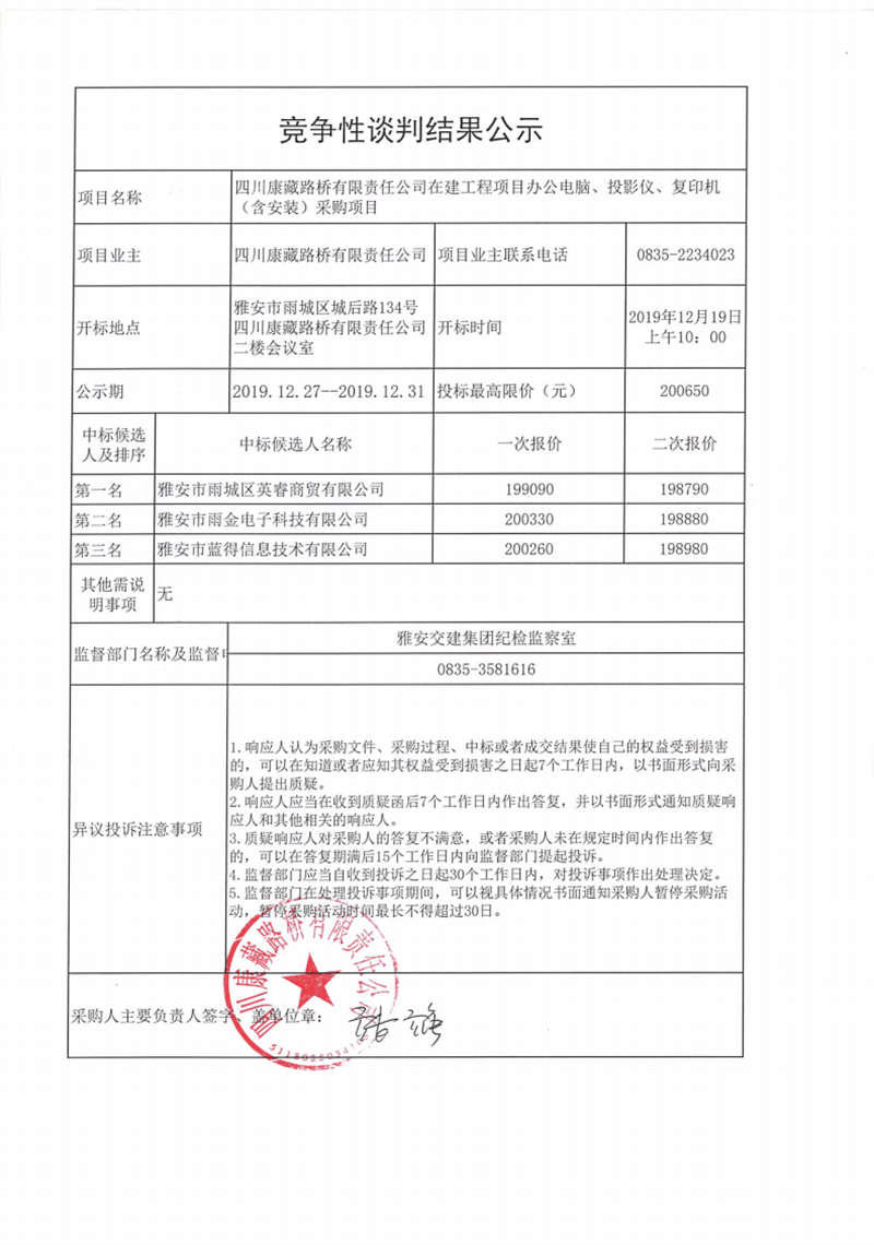 四川康藏路桥有限责任公司在建工程项目办公电脑、投影仪、复印机(含安装)采购项目竞争性谈判结果公示