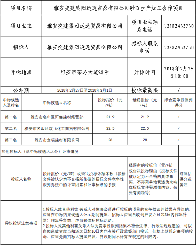 亿万先生MR集团运通贸易有限公司砂石生产加工合作项目竞争性谈判结果公示