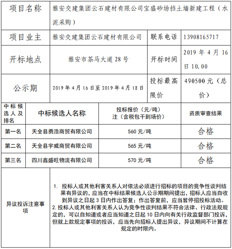 宝盛砂场挡土墙新建工程(水泥采购)项目竞争性谈判结果公示