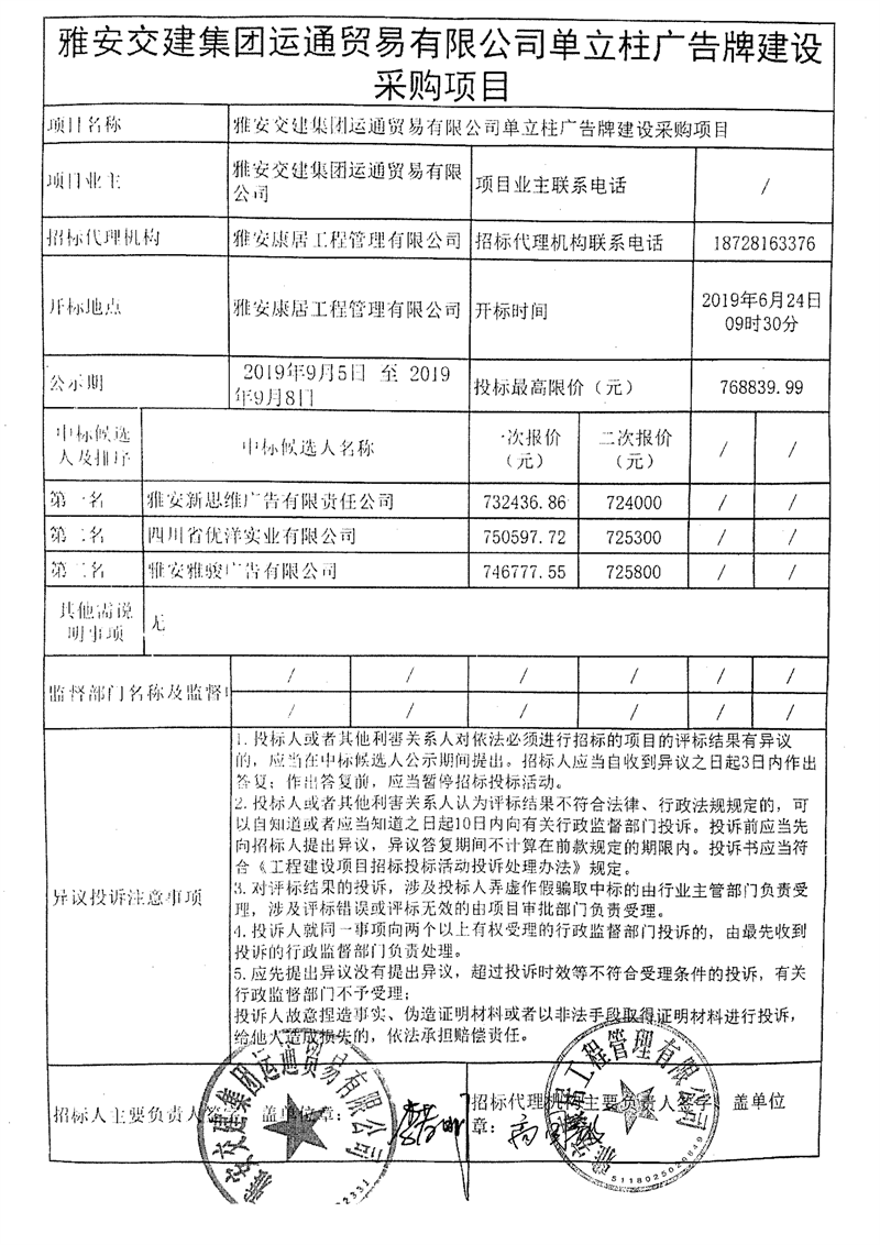 亿万先生MR集团运通贸易有限公司单立柱广告牌建设采购项目竞争性谈判结果公示