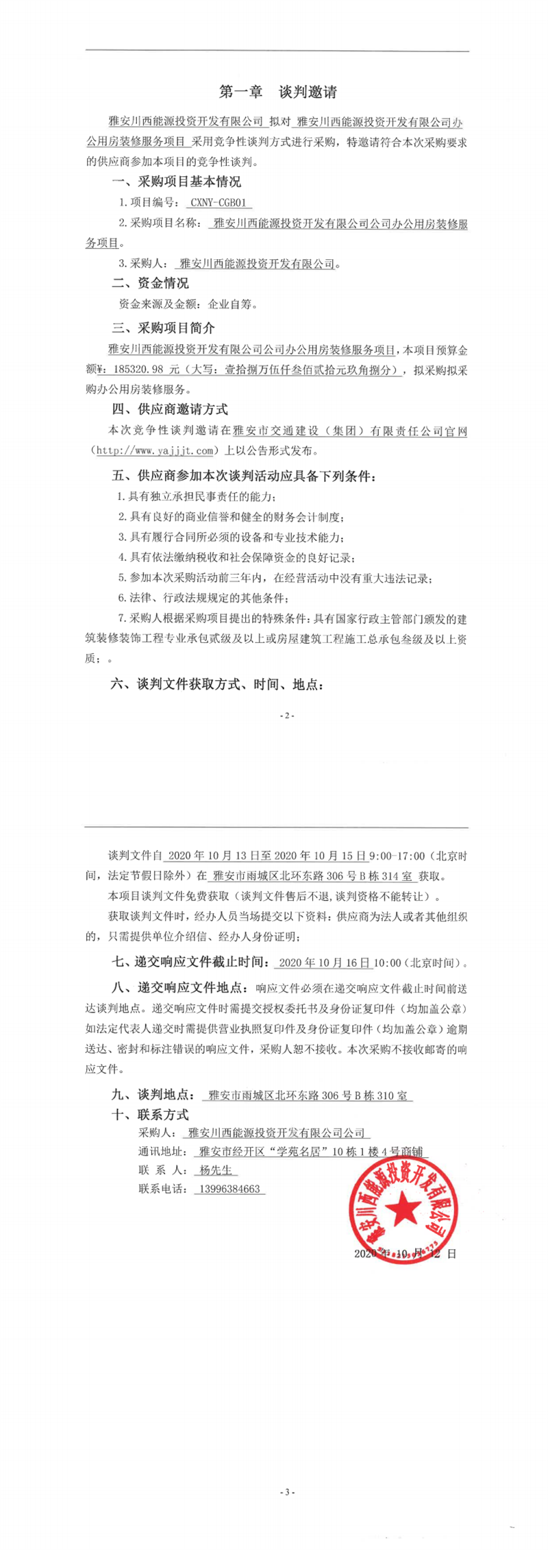 雅安川西能源投资开发有限公司办公用房装修服务项目竞争性谈判公告