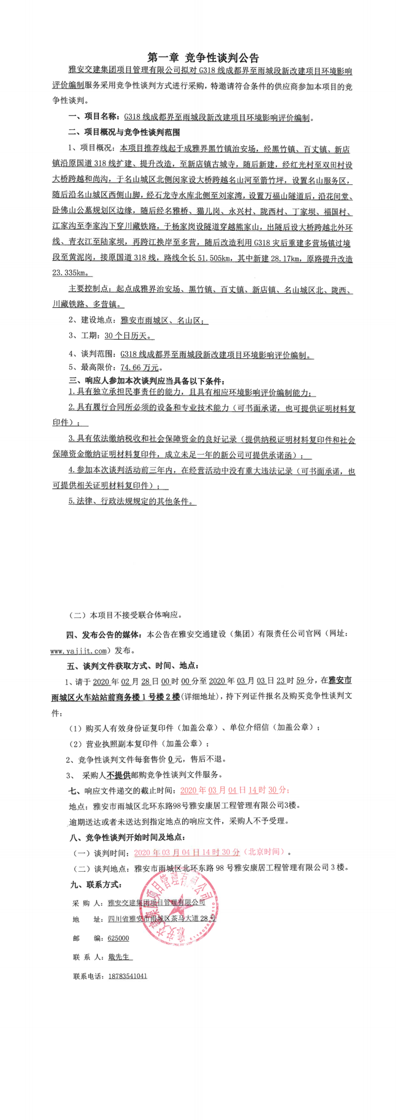 亿万先生MR集团项目管理有限公司G318线成都界至雨城段新改建项目环境影响评价编制竞争性谈判公告