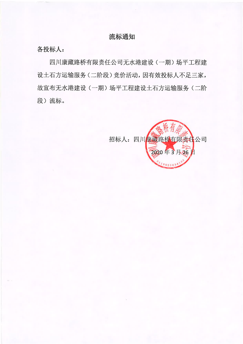 四川康藏路桥有限责任公司无水港建设(一期)场平工程建设土石方运输服务(二阶段)流标通知