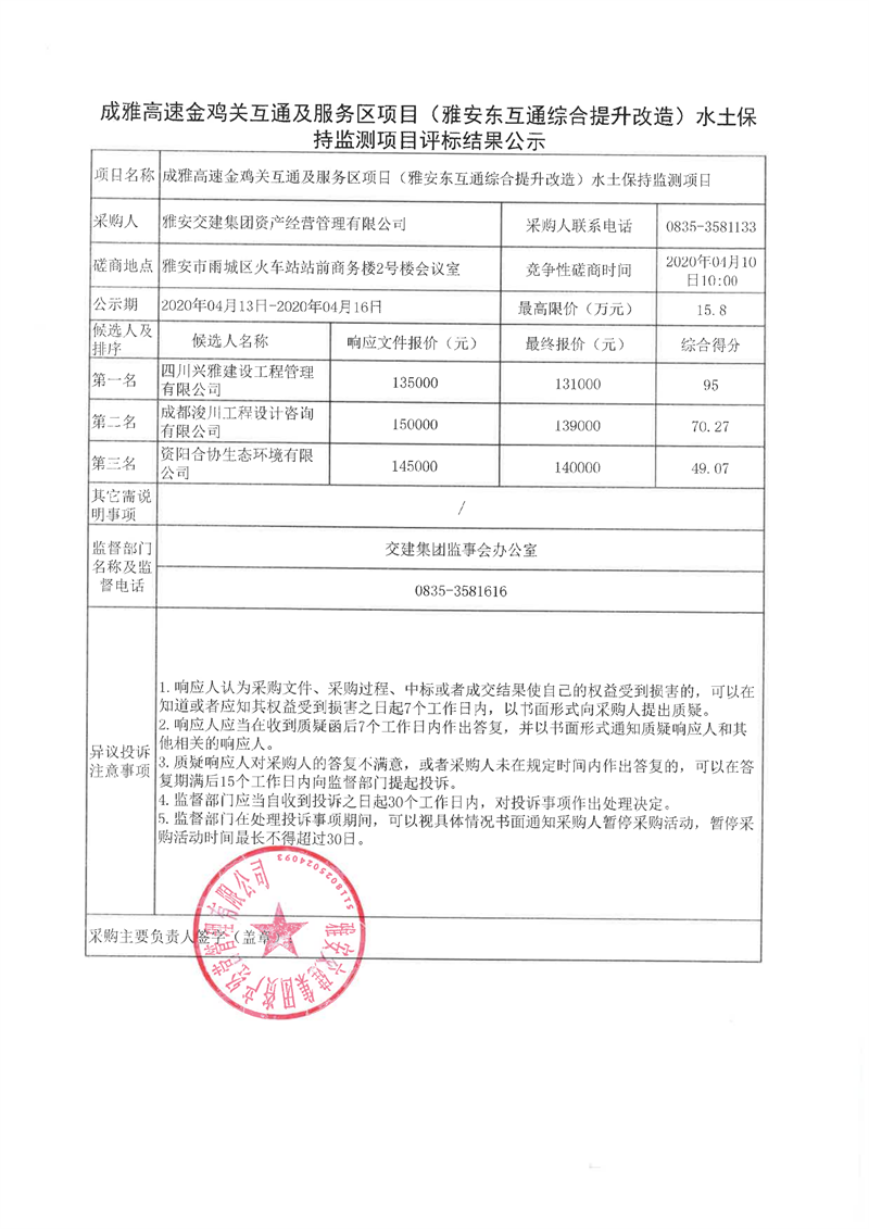 亿万先生MR集团资产经营管理有限公司成雅高速金鸡关互通及服务区项目(雅安东互通综合提升改造)水土保持监测项目评标结果公示
