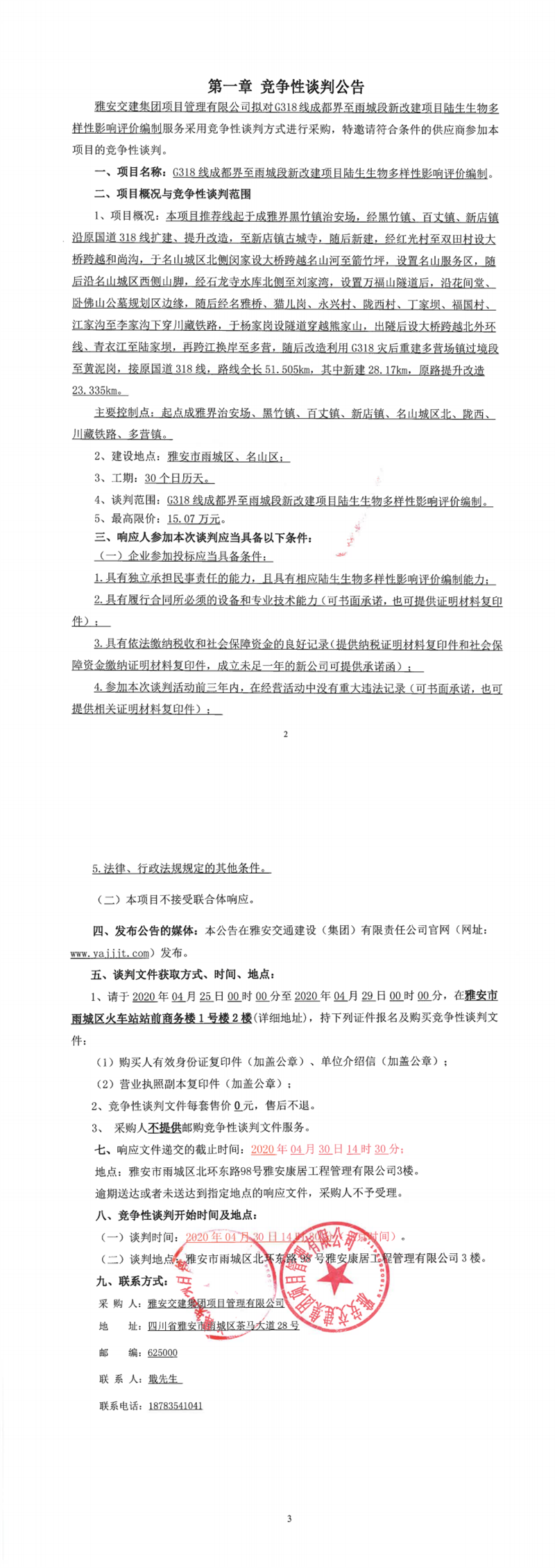 亿万先生MR集团项目管理有限公司G318线成都界至雨城段新改建项目陆生生物多样性影响评价编制竞争性谈判公告