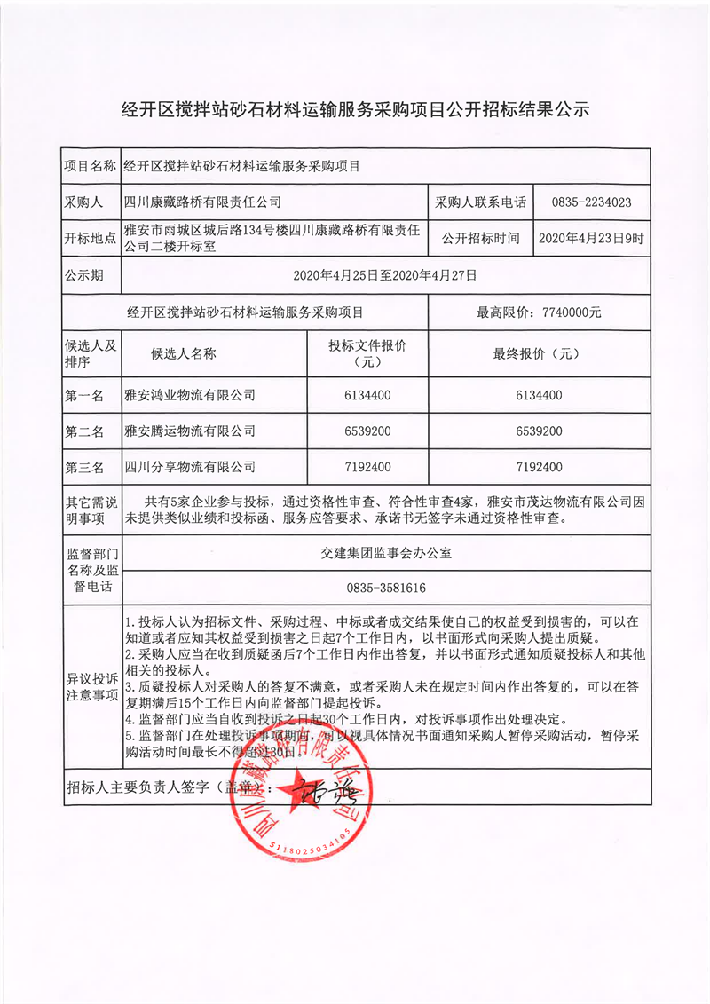 四川康藏路桥有限责任公司经开区搅拌站砂石材料运输服务采购项目公开招标结果公示