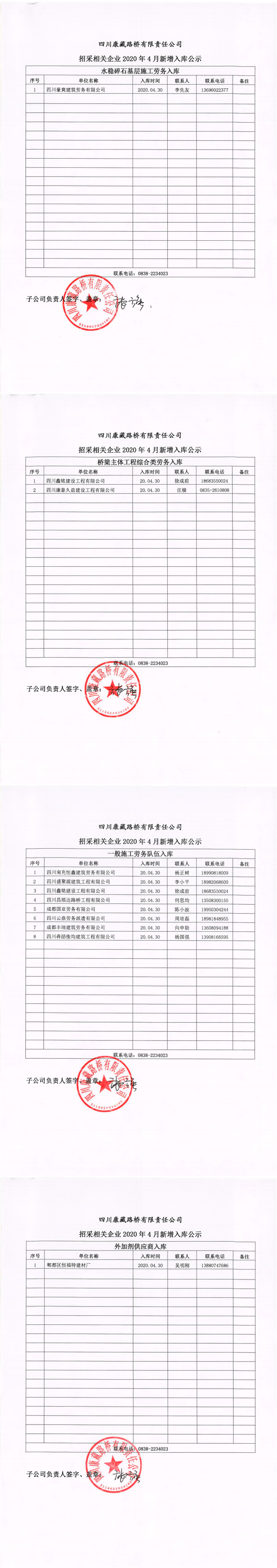 四川康藏路桥有限责任公司招采相关企业2020年4月新增入库公示