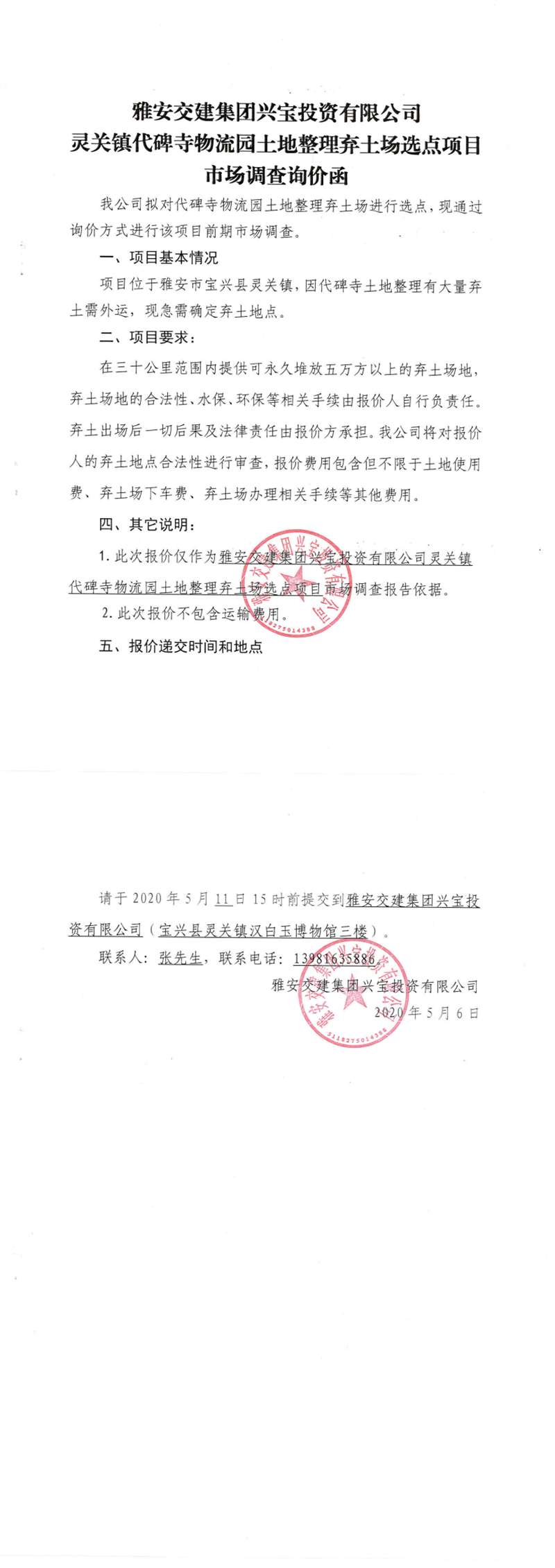 亿万先生MR集团兴宝投资有限公司灵关镇代碑寺物流园土地整理弃土场选点项目市场调查询价函