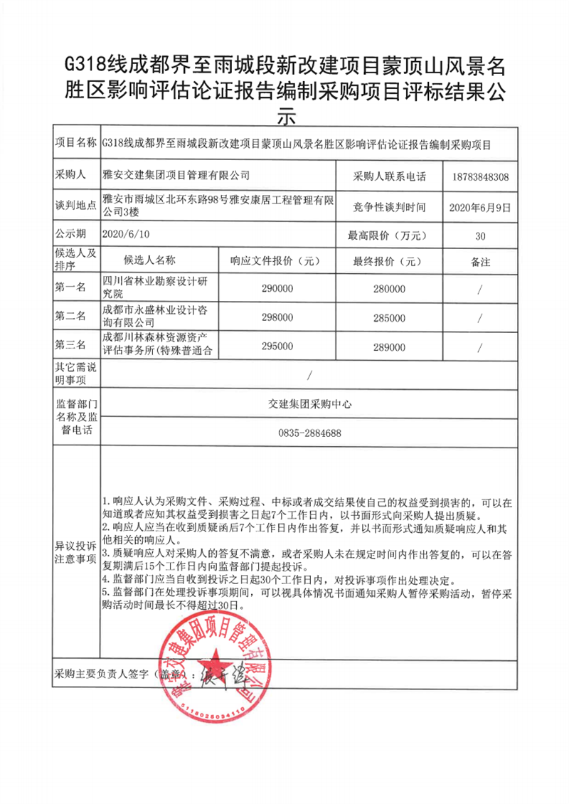 亿万先生MR集团项目管理有限公司G318线成都界至雨城段新改建项目蒙顶山风景名胜区影响评估论证报告编制采购项目评标结果公示