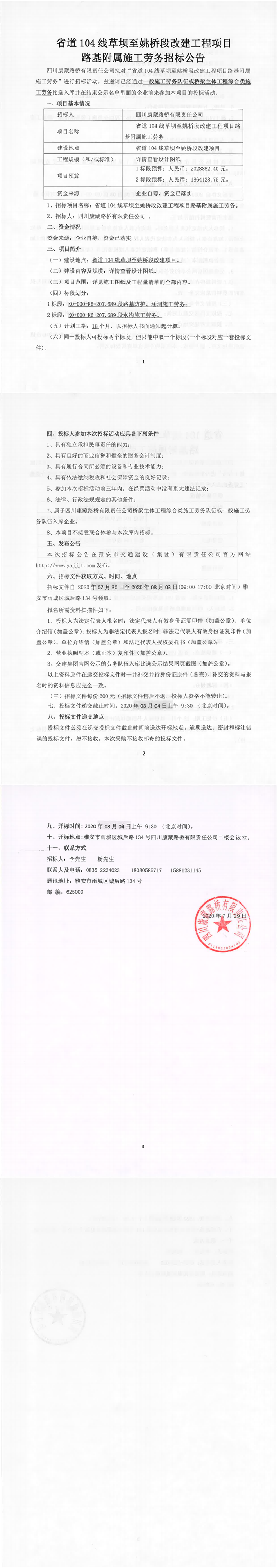 四川康藏路桥有限责任公司省道104线草坝至姚桥段改建工程项目路基附属施工劳务招标公告