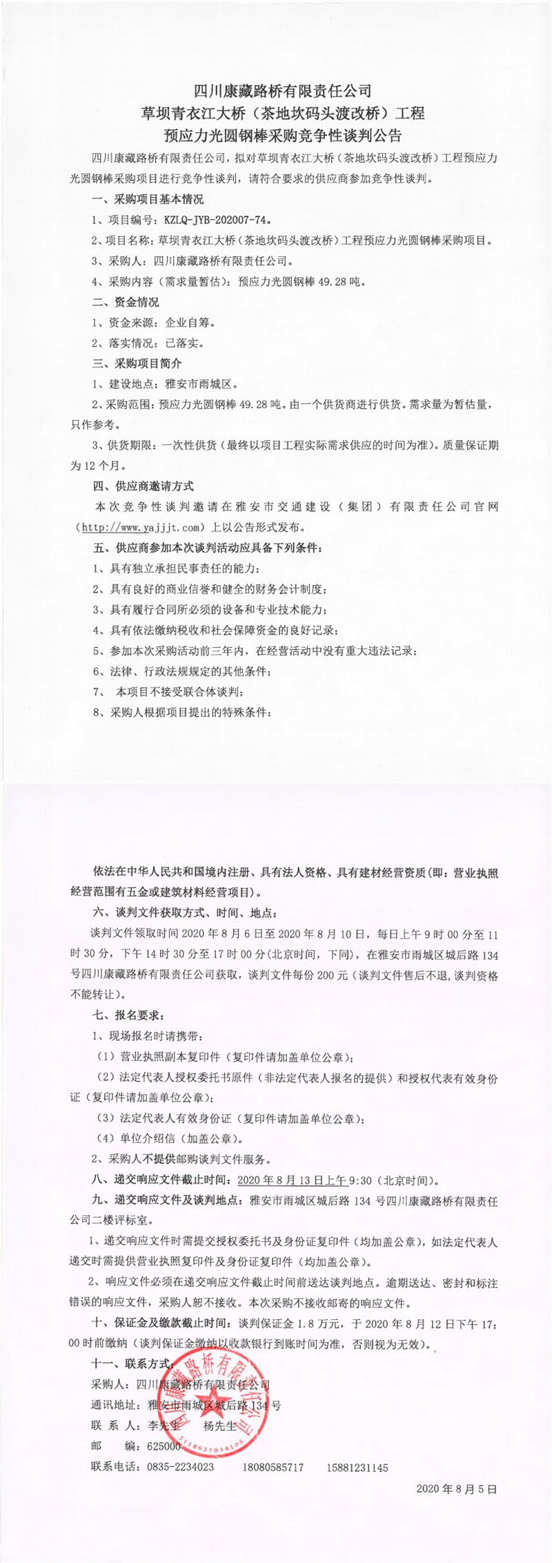四川康藏路桥有限责任公司草坝青衣江大桥(茶地坎码头渡改桥)工程预应力光圆钢棒采购竞争性谈判公告
