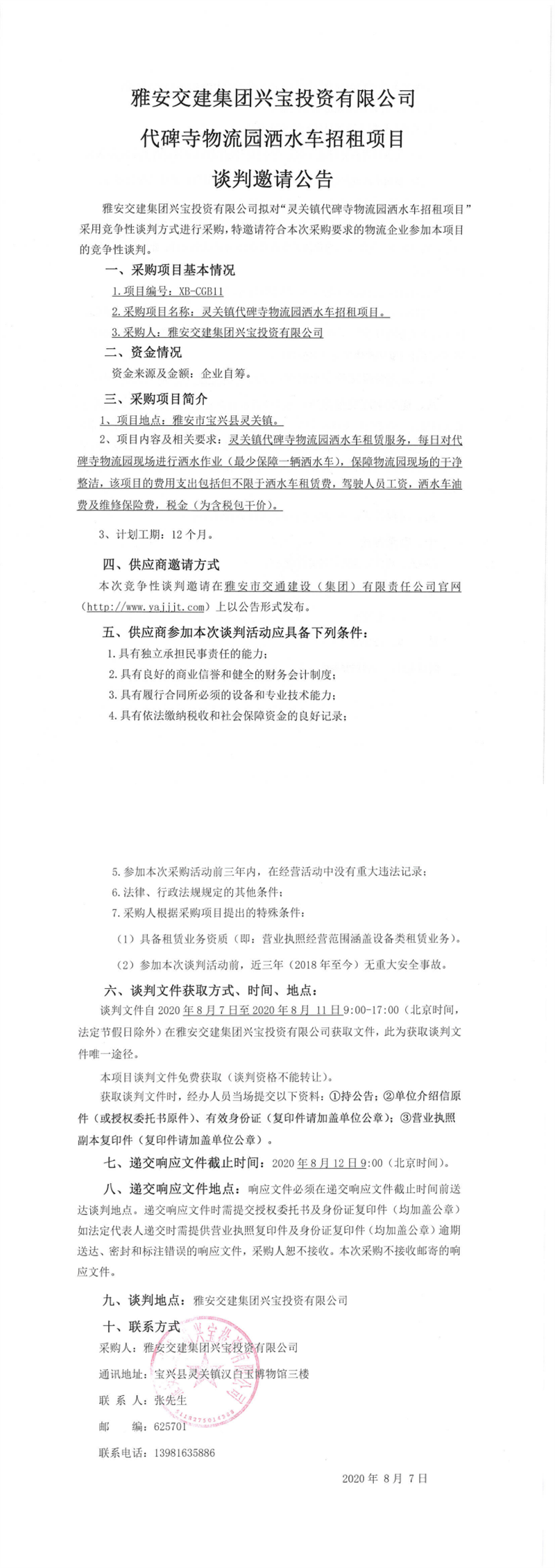 亿万先生MR集团兴宝投资有限公司代碑寺物流园洒水车招租项目谈判邀请公告