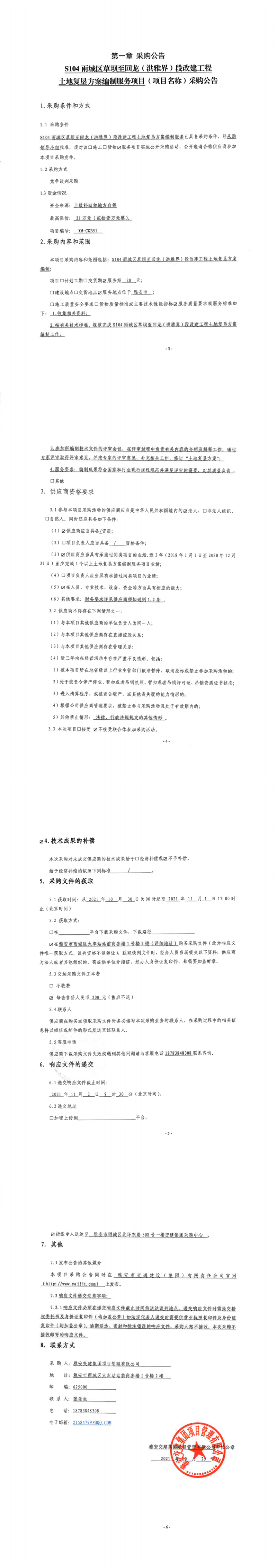 亿万先生MR集团项目管理有限公司S104雨城区草坝至回龙(洪雅界)段改建工程土地复垦方案编制服务项目采购公告