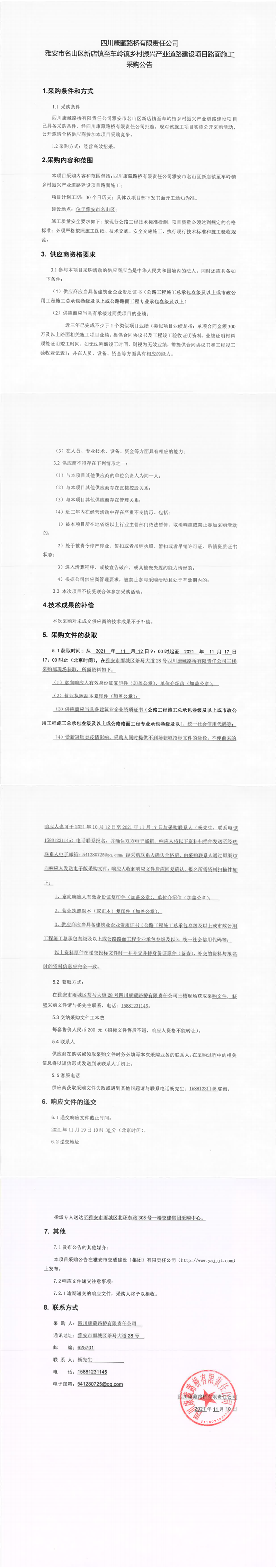 四川康藏路桥有限责任公司雅安市名山区新店镇至车岭镇乡村振兴产业道路建设项目路面施工采购公告