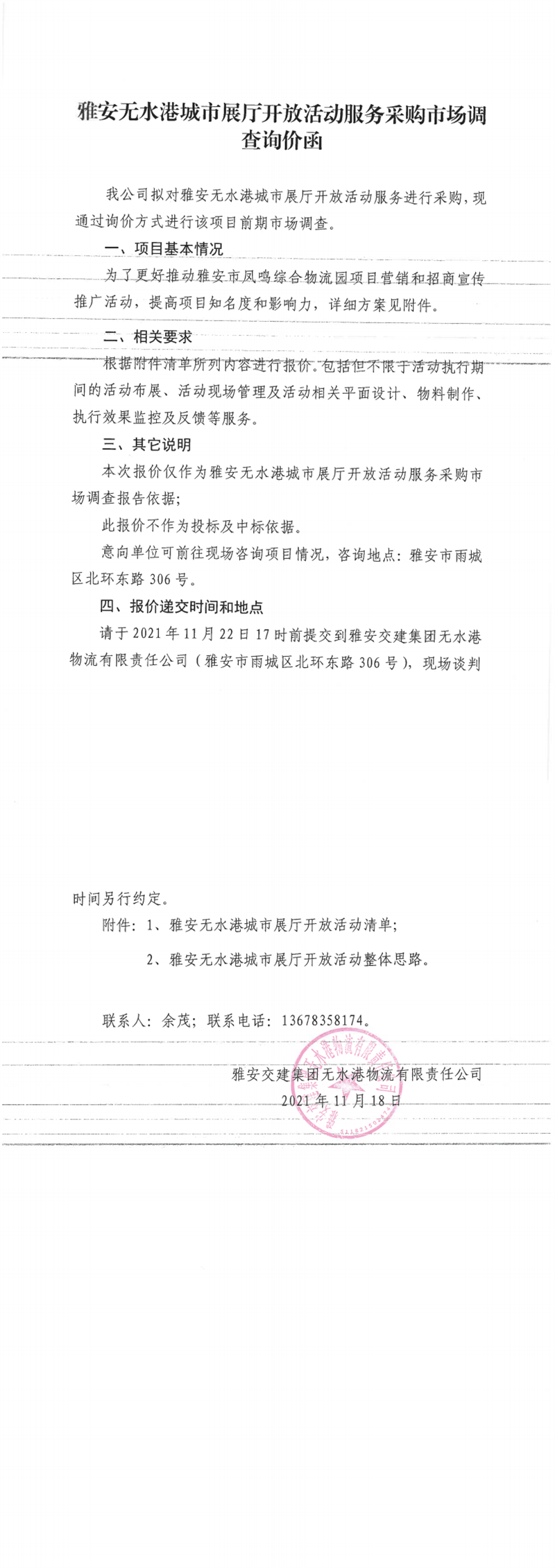 亿万先生MR集团无水港物流有限责任公司雅安无水港城市展厅开放活动服务采购市场调查询价函