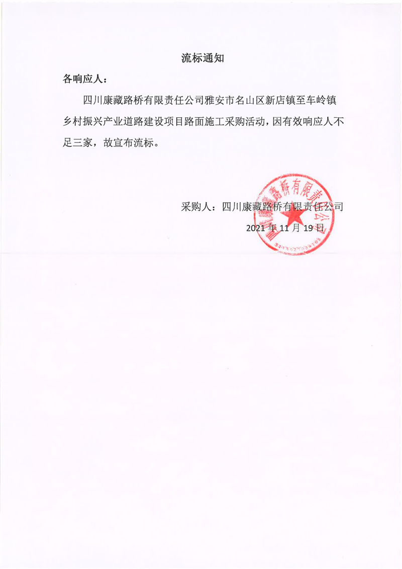 四川康藏路桥有限责任公司雅安市名山区新店镇至车岭镇乡村振兴产业道路建设项目路面施工采购流标通知