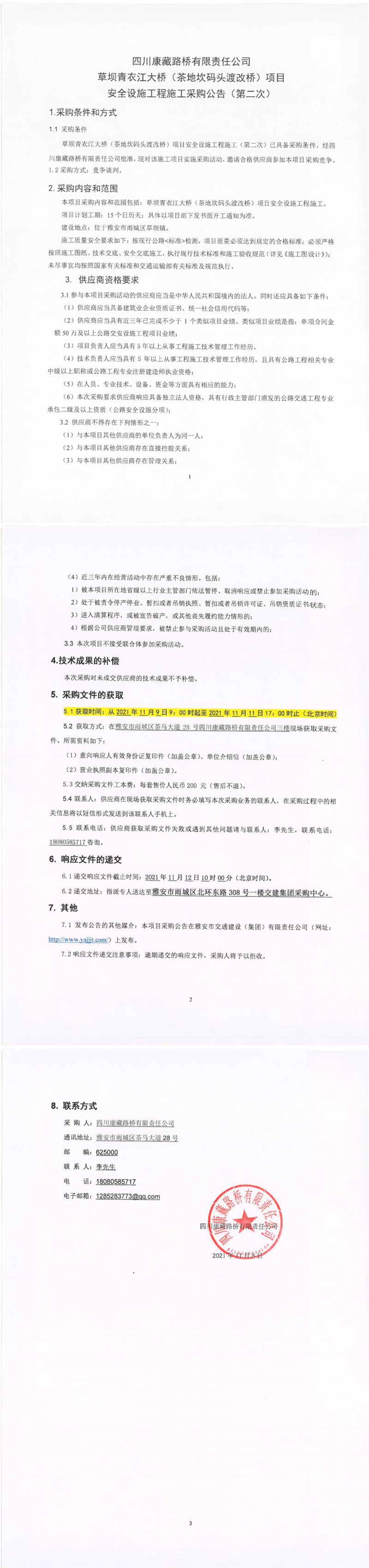 四川康藏路桥有限责任公司草坝青衣江大桥(茶地坎码头渡改桥)项目安全设施工程施工采购公告(第二次)