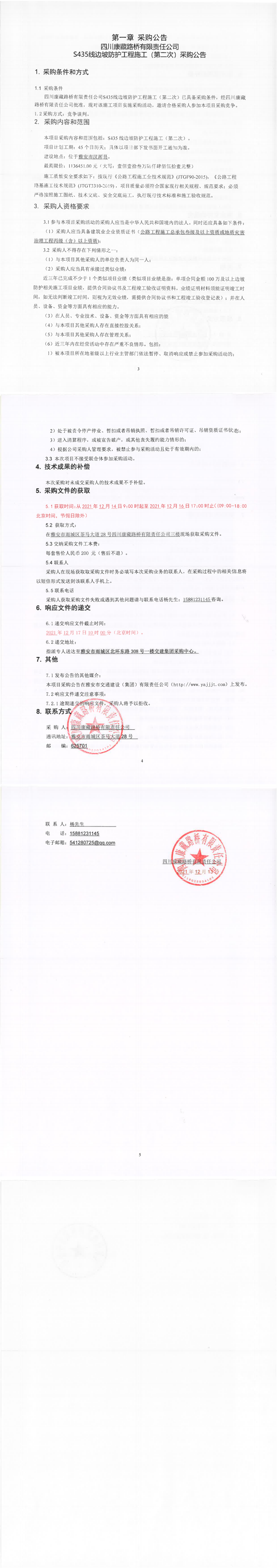 四川康藏路桥有限责任公司S435线边坡防护工程施工(第二次)采购公告