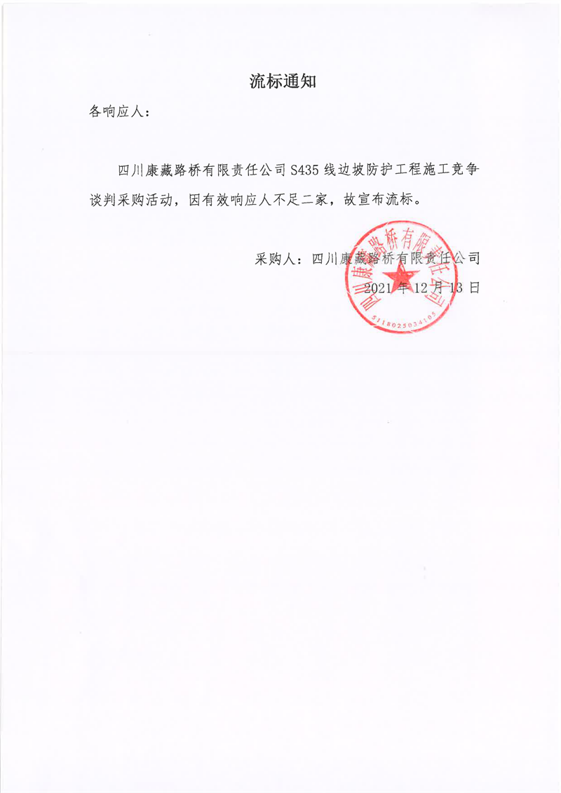 四川康藏路桥有限责任公司S435线边坡防护工程施工采购流标通知