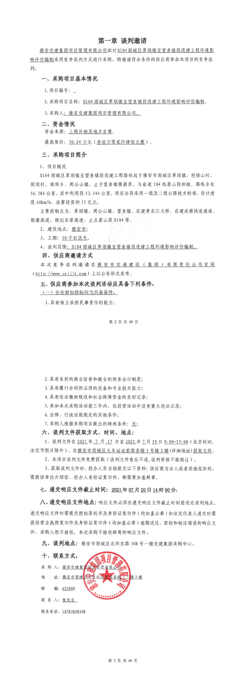 亿万先生MR集团项目管理有限公司S104雨城区草坝镇至望鱼段改建工程环境影响评价编制竞争谈判公告