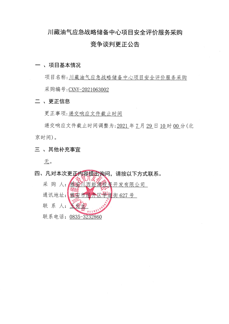 雅安川西能源投资开发有限公司川藏油气应急战略储备中心项目安全评价服务采购竞争谈判更正公告