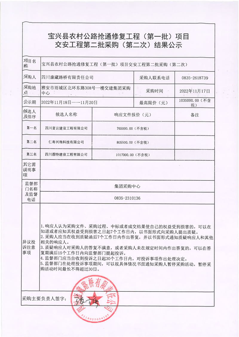 四川康藏路桥有限责任公司宝兴县农村公路抢通修复工程(第一批)项目交安工程第二批采购(第二次)结果公示