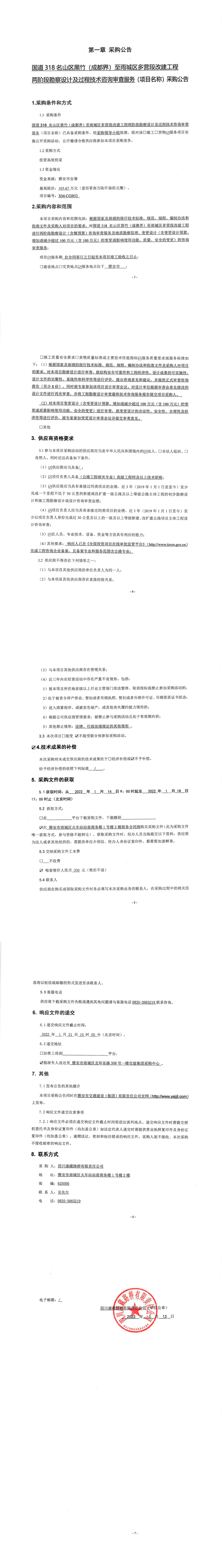 四川康藏路桥有限责任公司国道318名山区黑竹(成都界)至雨城区多营段改建工程两阶段勘察设计及过程技术咨询审查服务采购公告