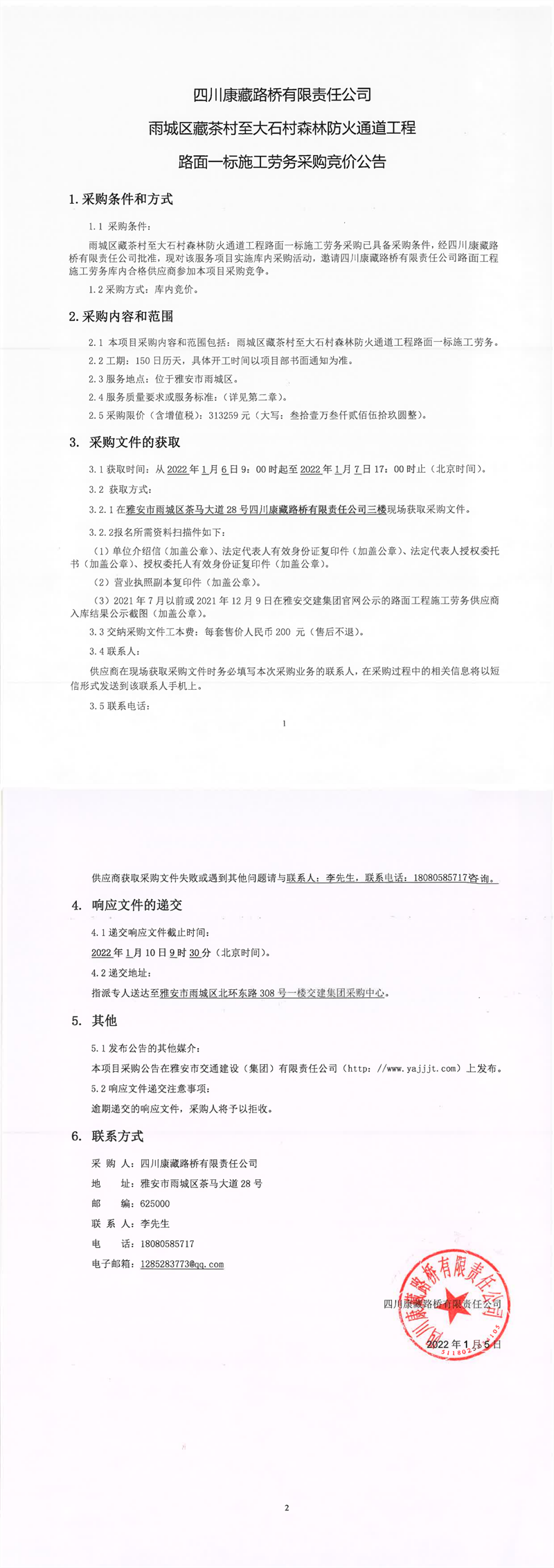 四川康藏路桥有限责任公司雨城区藏茶村至大石村森林防火通道工程路面一标施工劳务采购竞价公告