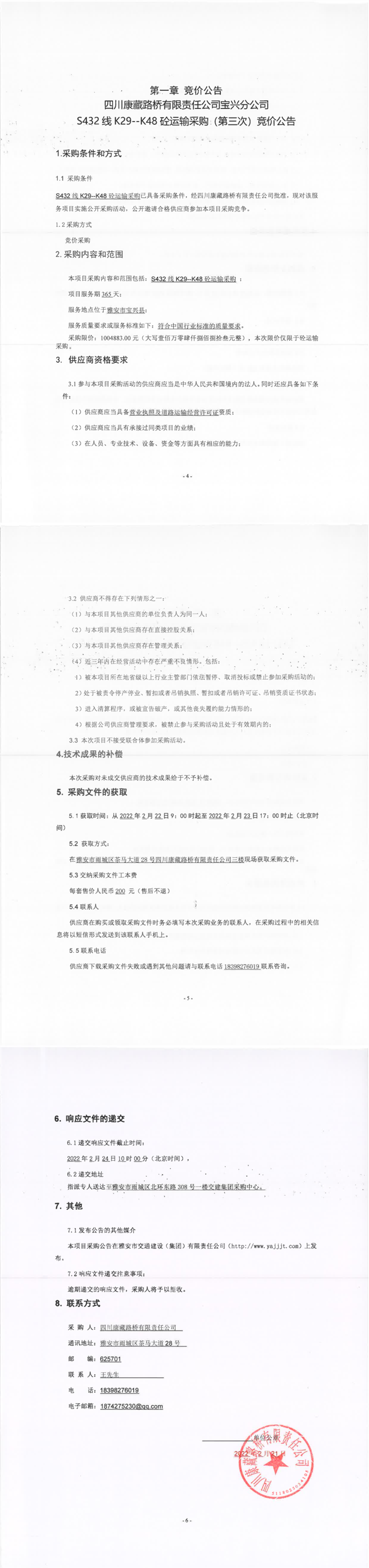 四川康藏路桥有限责任公司宝兴分公司S432线K29-K48砼运输采购(第三次)竞价公告