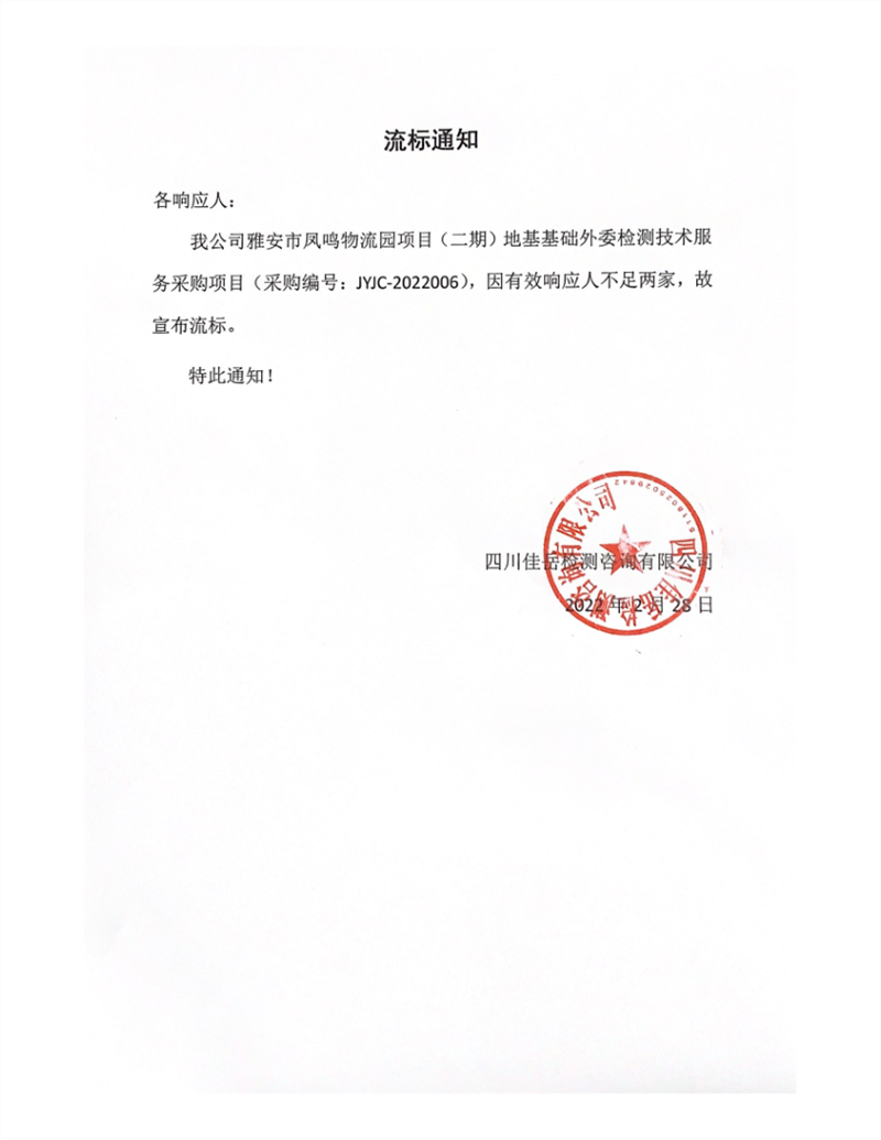 四川佳岳检测咨询有限公司雅安市凤鸣物流园项目(二期)地基基础外委检测技术服务采购项目流标通知