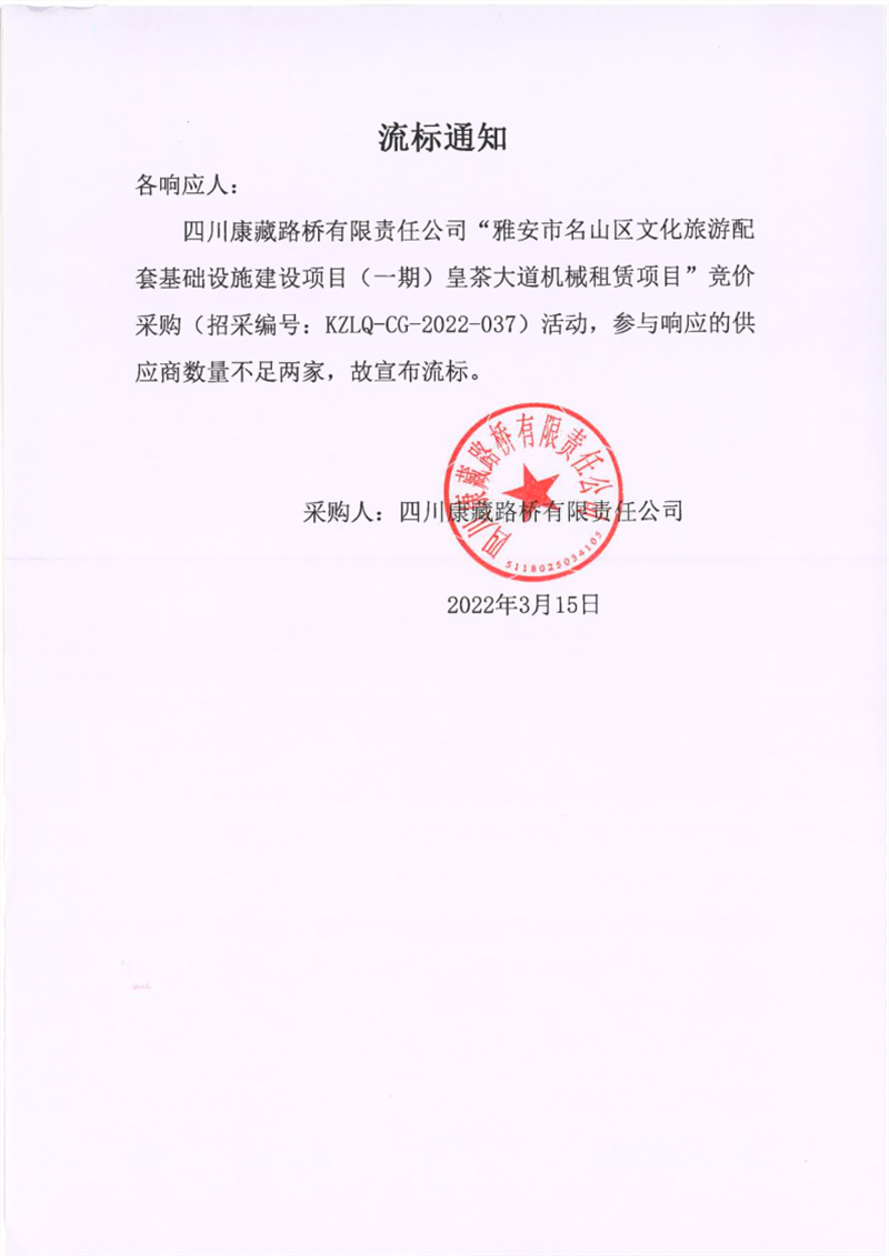 四川康藏路桥有限责任公司雅安市名山区文化旅游配套基础设施建设项目(一期)皇茶大道机械租赁项目流标通知