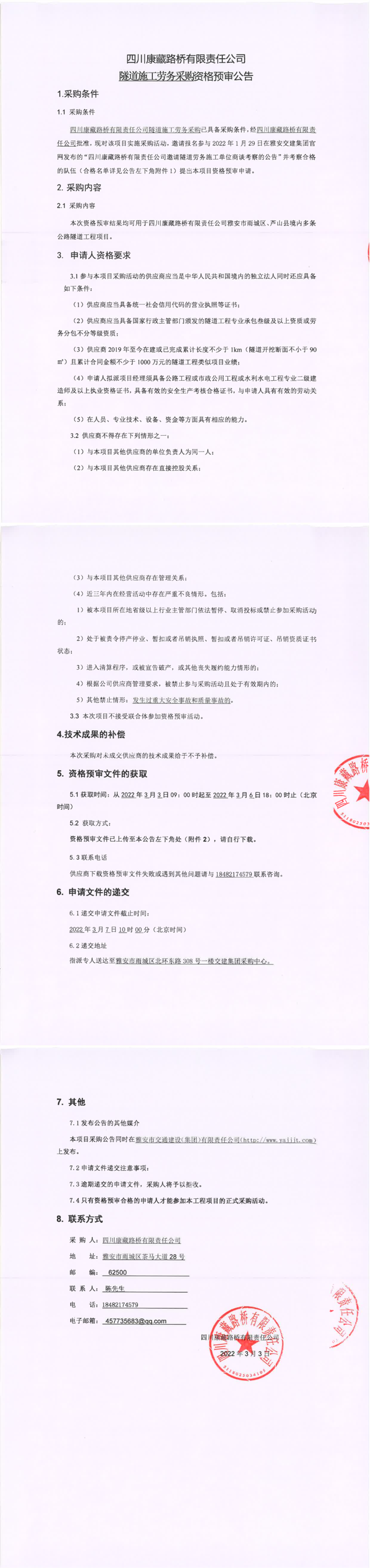 四川康藏路桥有限责任公司隧道施工劳务采购资格预审公告