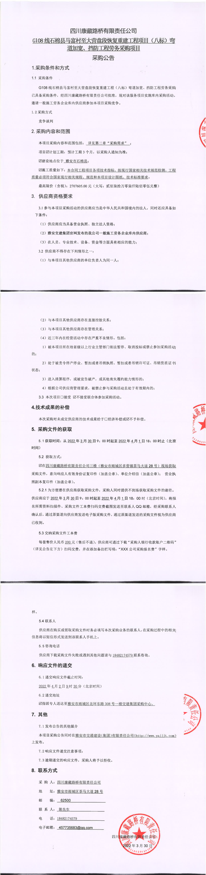 四川康藏路桥有限责任公司G108线石棉县马富村至大营盘段恢复重建工程(八标)弯道加宽、挡防工程劳务采购项目采购公告