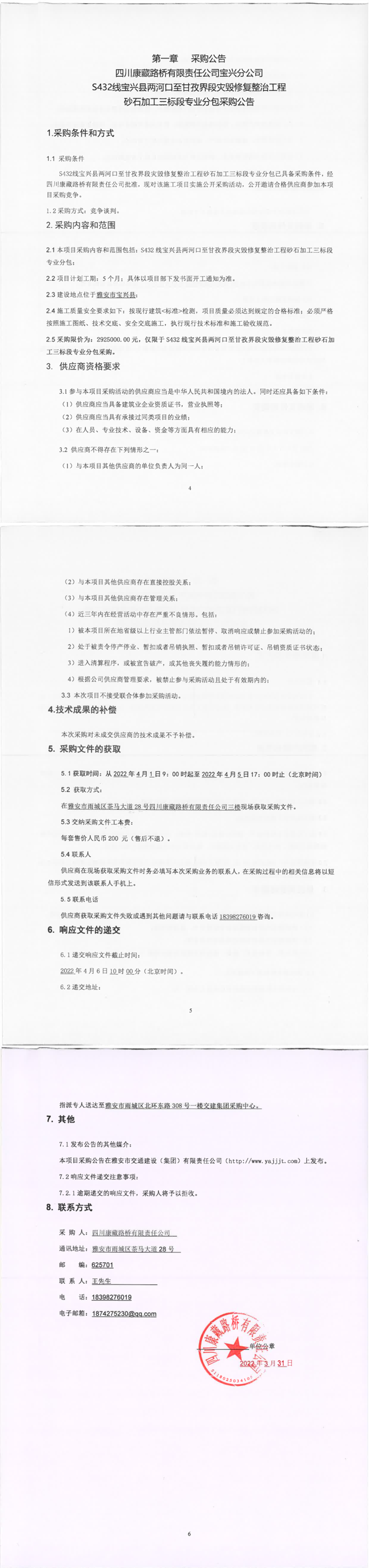四川康藏路桥有限责任公司S432线宝兴县两河口至甘孜界段灾毁修复整治工程砂石加工三标段专业分包采购公告