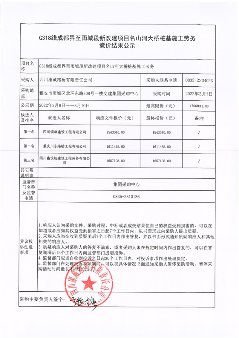 四川康藏路桥有限责任公司G318线成都界至雨城段新改建项目名山河大桥桩基施工劳务竞价结果公示