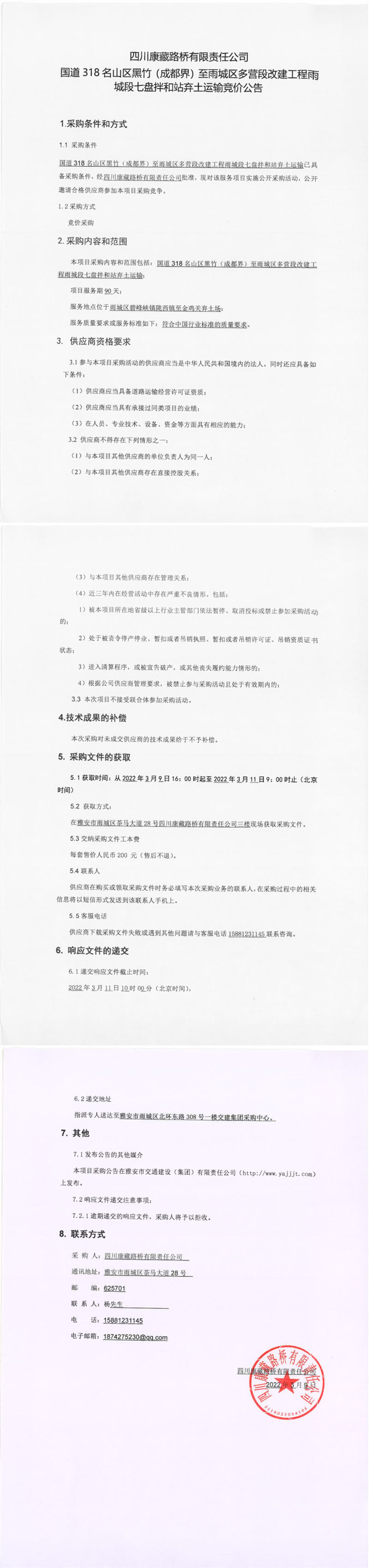 四川康藏路桥有限责任公司国道318名山区黑竹(成都界)至雨城区多营段改建工程雨城段七盘拌和站弃土运输竞价公告
