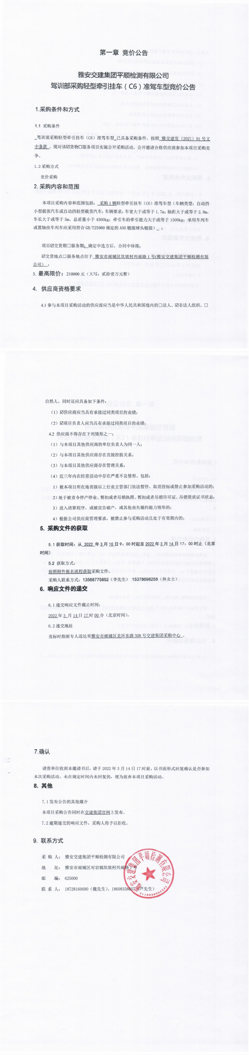 亿万先生MR集团平顺检测有限公司驾训部采购轻型牵引挂车(C6)准驾车型竞价公告